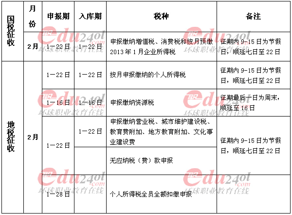 环球网校:2013年02月纳税申报办税日历