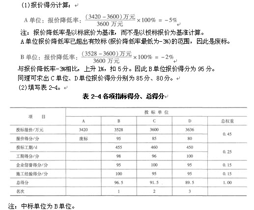 2.(1)投标过程中的投标技巧有不平衡报价法、倒计时报价法和联合投标报价法。 (2)B投标人运用了不平衡报价法。