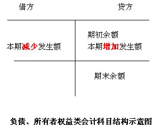 由于会计平衡公式“资产=负债+所有者权益”所决定,负债、所有者权益类会计科目的基本结构与资产类会计科目的基本结构正好相反,所以此类会计科目的贷方登记负债、所有者权益的增加额,借方登记负债、所有者权益的减少额,若有期末余额,一般在贷方,表示负债、所有者权益的现有数额。负债、所有者权益类会计科目的基本结构如下图所示。