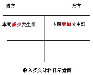 收入类会计科目的基本结构与所有者权益类会计科目的基本结构基本相同。因为收入的增加可以视为所有者权益的增加。其贷方登记收入的增加额,借方登记收入的减少或转销额,期末一般无余额。收入类会计科目的基本结构如下图所示。