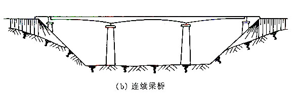 (2)连续梁式桥和悬臂梁式桥。连续梁桥相当于多跨简支梁桥在中间支座处相连接贯通,形成整体的、连续的、多跨的梁结构。连续梁桥是大跨度桥梁广泛采用的结构体系之一,一般采用预应力混凝土结构。