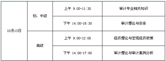 2013年度审计专业技术资格考试定于10月13日举行,分初、中、高级三个级别。初、中级考试设《审计专业相关知识》和《审计理论与实务》两个科目;高级考试设《经济理论与宏观经济政策》和《审计理论与审计案例分析》两个科目。具体考试时间和考试科目如下:
