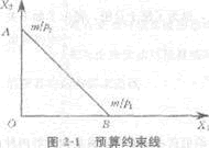 在图2-1中,横轴X1表示商品1的消费数量,纵轴X2表示商品2的消费数量。如果全部收入m都用于购买商品1,则所能购买到的数量为m/P1,如果全部收入m都用于购买商品2,则所能购买到的数量为
