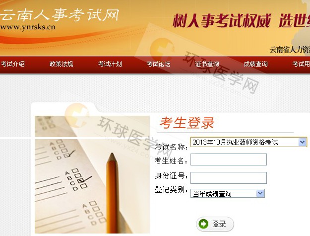 2013年度云南执业药师资格考试成绩查询开始,环球网校医学考试网第一时间发布执业药师考试成绩查询信息。