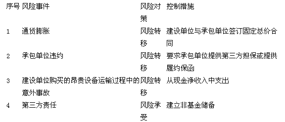 根据下面内容,回答题: 某建设单位建设一热电厂。该单位委托甲工程监理公司对工程进行监理,委托乙施工单位作为项目的施工总承包单位,并决定向美国丙重型设备制造商订购发电设备。 甲监理公司的总监理工程师在主持编制监理规划时,安排了一位专业监理工程师负责风险分析和相应监理规划内容的编写工作。根据该项目的具体情况,监理工程师对建设单位的风险事件提出了相应的风险对策,并制定了相应风险控制措施,见下表。