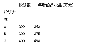 某项目现有三个互斥的投资方案A、B、C,欲从中选择最有利的方案,三个投资方案的投资额及一年后的净收益率如下表所示。各方案的寿命期都是一年,一年后的净残值为零。假设基准收益率为6%。