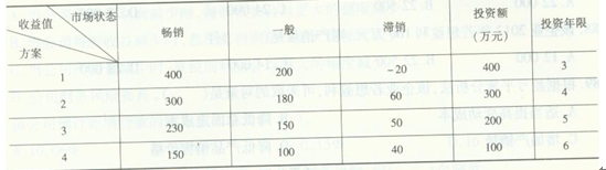 某公司十年来一直只生产电视机显像管,产品质量较高,经营状况良好。2006年该公司与某电视机生产企业联合,开始生产电视机成品,拟生产三种不同型号的电视机产品,有四个备选方案,每个方案的投资额、经营期限、市场状态和收益值如下表所示,畅销、一般、滞销的概率分别为03、05、02。