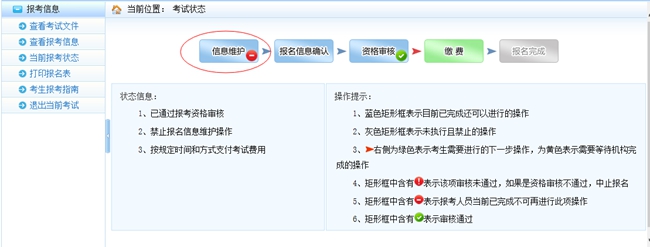 答:报考人员在报名信息确认前可以修改报名信息,在考试状态流程图点击“信息维护”进行操作。如果已经打印报名信息表,则视为已经确认报名信息内容,本人不可自行修改报名信息。