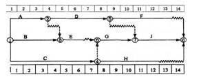 某工程项目可以分解为A、B、C等10项工作,根据各项工作之间的逻辑关系及持续时间编制的双代号网络计划如下图所示(时间单位:周)。根据题意,回答下列问题:
