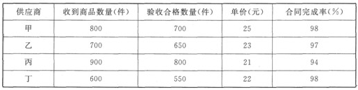 某商品流通企业的某种商品是由甲、乙、丙、丁四家供应商供应的,现该企业想建立长期合作关系,需要对这四家供应商进行比较,所得统计资料如下表所示。选择的标准有商品质量、价格、合同完成率等。找到了一家比较合适的供应商后,与该供应商建立长期合作关系。该商品流通企业对选出的比较合适的供应商的要求更高了,对原有选择标准中的商品质量、总成本、交付及时等有新的要求,还要对选出的比较合适的供应商绩效进行评审。