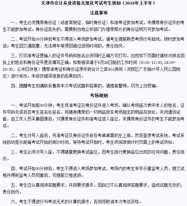 2015年上半年天津会计从业资格考试时间:5月30日、31日、6月6日,2015上半年天津会计从业资格考试延考考试时间2015年6月23日-7月19日。2015年上半年天津会计从业资格考试考生须知如下: