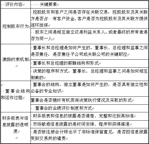 信贷人员对客户法人治理结构的评价要着重考虑控股股东行为的规范和对内部控制人的约束和激励这两个因素。在此基础上,分析董事会的结构、运作及信息的披露。客户法人治理结构评价的内容如表6-1所示。