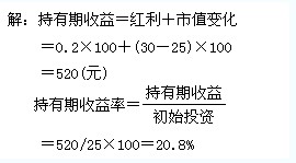 【例题】张先生去年初以每股25元的价格购买了100股中国移动的股票,过去一年中得到每股0.2元的红利,年底时以每股30元的价格出售,其持有期收益和收益率分别为多少?