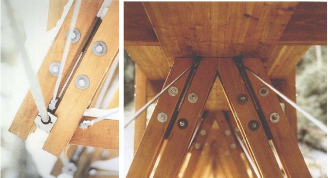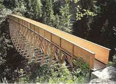 这座桥是木和索结合的优秀作品,木材用于受压,钢索用于受拉。木材由于自重轻,所有构件都能用4.3吨的直升机运来工地,解决了偏远地区的材料运送。