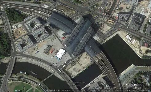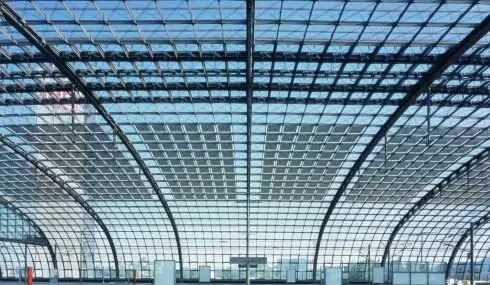 柏林中央火车站于2006年建成,是集长途交通、地区交通、短途交通为一体的欧洲最大的火车站。建筑与结构设计分别由德国的gmp事务所和sbp事务所完成。车站包含三部分:东西向长约430m的轻轨站台、两幢板状的办公楼、位于两个楼之间的45×159m的火车站大厅,站台结构贯穿两栋楼。轻轨站台、火车站大厅用弧形的玻璃顶遮盖
