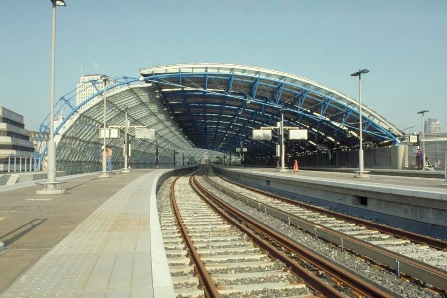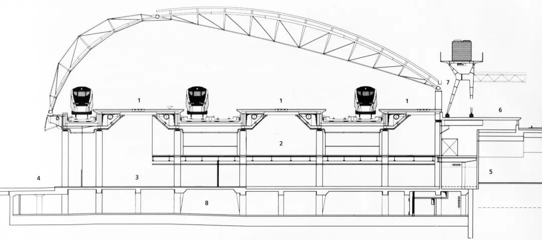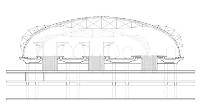 要讲的主角是东西向站台雨棚,跨度44~66m,采用了传统火车站常用的拱形结构。与滑铁卢车站类似,由于两边有列车通行的净高要求,拱在两个支座处需快速上升,无法做成悬链线。
