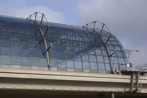 覆盖轻轨站台的玻璃顶结构,长约320m,跨度约66m,覆盖6股轨道和3列站台,采用索桁架结构,按照永久荷载作用下的弯矩图布索,将提篮拱转换为推力线。两榀索桁架之间为单层正方形或长方形网格状壳体,网格尺寸为1.5~1.7m,沿网格对角线设置双层交叉拉杆。玻璃上安装了780块太阳能板,约占屋面面积的8.4%。