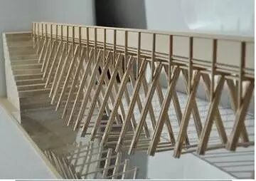 桥的主结构由三部分组成:(1)U形桥面板;(2)H形框架为U形桥面板加强侧向刚度;(3)断面为三角形的桁架支撑着上面两个结构,桁架底部为两根拉索,桁架竖腹杆是木材,其间设置对角钢拉索。H形框架与桁架腹杆连接。