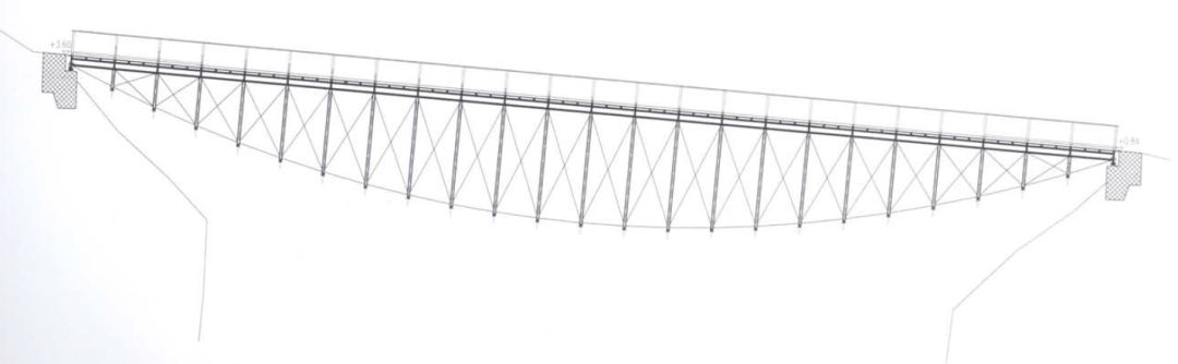 桥上部很窄,其侧向刚度比较弱。所以,特拉弗西那桥用三角形的腹杆将底部的拉索向外撑开,越往跨中,撑的越开。其稳定性大大增强。