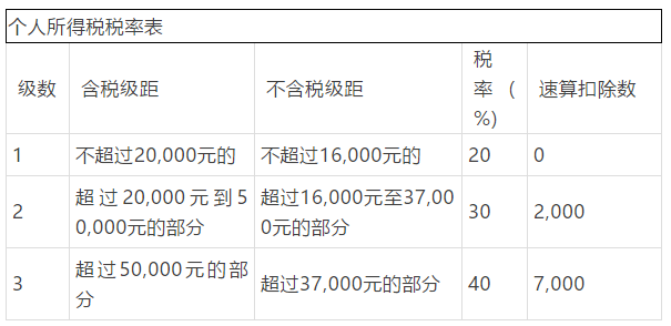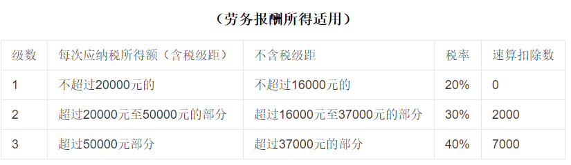1、本表所称每次应纳税所得额,是指每次收入额减除费用800元(每次收入额不超过4000元时)或者减除20%的费用(每次收入额超过4000元时)后的余额。
