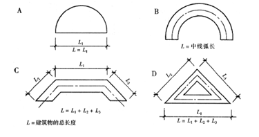 13按建筑设计防火规范,建筑物长度计算的平面简图(如下图),其中哪个是正确的(B )。