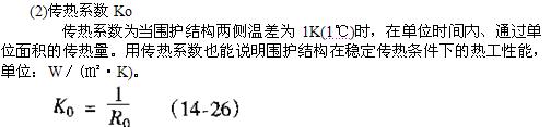 传热阻是热量从平壁一侧空间传至另一侧空间时所受到的总阻力,它是衡量围护结构在稳定传热条件下的一个重要的热工性能指标,单位:┫?K/W。