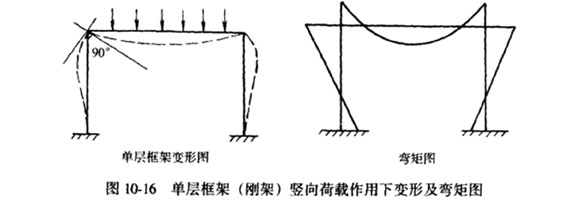 (2)在竖向荷载作用下,梁、柱互相约束,从而减少横梁的跨中弯矩,其变形及弯矩图见图10―16。