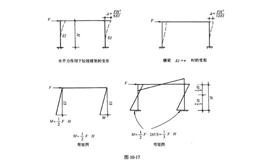 (3)在水平力作用下,梁柱的刚接可提高柱子的抗推刚度减小水平变形,成为很好的抗侧力结构(见图10―17)。