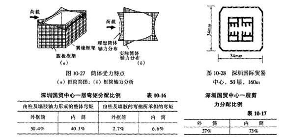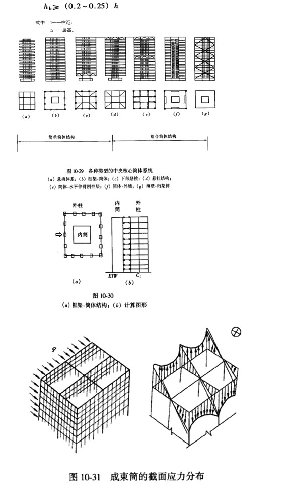 2.简体―框架结构[图10-26(b)],亦称框架―核心筒结构,由中央剪力墙核心筒和周边外框架组成;