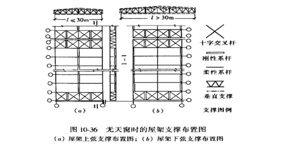 7.屋架的上弦横向支撑和下弦横向水平支撑,一般宜设在厂房两端或温度伸缩缝区段两端的第一个屋架间内(图10-36)或第二个屋架间内。当温度伸缩缝区段的长度大于