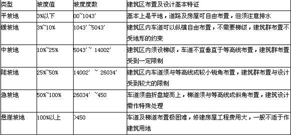 地形指地表面起伏的状态(地貌)和位于地表面的所有固定性物体(地物)的总体,主要是采用等高线来表示地形。地形图上相邻两条等高线之间的水平距离称为等高线间距,其疏密反映了地面坡度的缓与陡。根据坡度的大小,可将地形划分为六种类型,地形坡度的分级标准及与建筑的关系见表1--1。