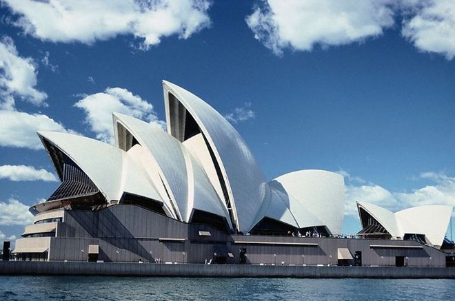 悉尼歌剧院的外型犹如即将乘风出海的白色风帆,与周围景色相映成趣。悉尼歌剧院是从20世纪50年代开始构思兴建,1955年起公开徵求世界各地的设计作品,至1956年共有32个国家233个作品参选,後来丹麦建筑师约恩?伍重的设计屏雀中选,建设从1959年3月开始,直至1973年10月竣工,斥资1亿零200万澳大利亚元完成建造,为了筹措经费,除了募集基金外,澳大利亚政府还曾於1959年发行悉尼歌剧院彩券。