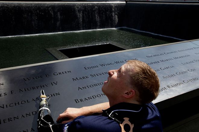 当地时间2012年7月4日,美国一名残疾海军陆战队员在参观9•11纪念馆时仰望一号世贸中心大楼。