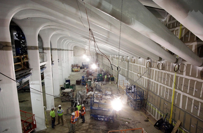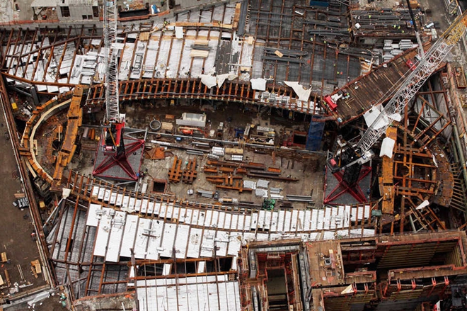 当地时间2012年9月7日,世贸中心链接东西方向的通道的拱形钢柱下面的施工现场。这个地下通道将连接世贸中心交通枢纽和数幢大楼。