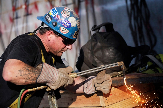 一名钢铁工人正在世贸中心施工现场切割钢支架。