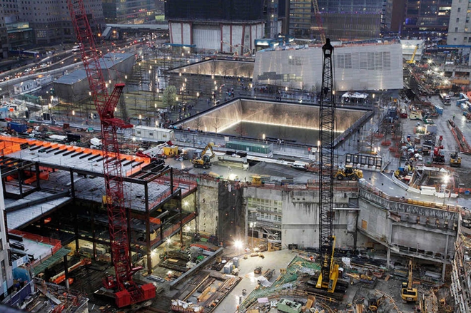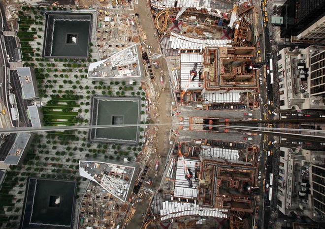 当地时间2012年7月19日,新的世贸中心建设工地的鸟瞰图,左边是车辆安全中心,中间是国家9•11纪念馆和博物馆。