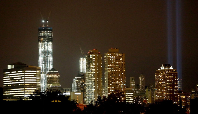 当地时间2012年9月6日,一号世贸中心大楼(左侧)以及周围的摩天大楼都亮起了灯,纪念9•11恐怖袭击事件11周年。