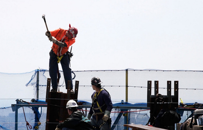当地时间2012年4月30日,在一号世贸中心大楼施工现场,一名钢铁工人正在调整一个钢柱,为将其与旁边的另一个钢柱连接起来做准备。