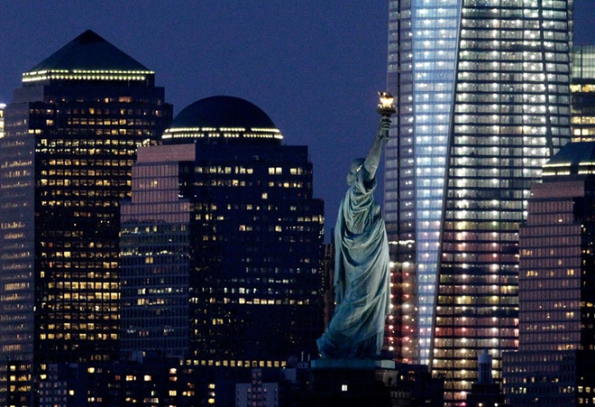 当地时间2012年7月2日,楼体亮着各色灯光的一号世贸中心大楼(右)和前方的自由女神像。
