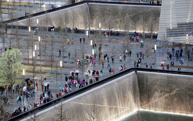 当地时间2012年4月1日,参观国家9•11纪念馆的游人在绕着世贸中心的两座水池行走。