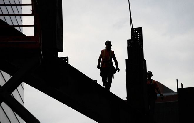 当地时间2012年6月25日,在三号世贸中心大楼施工现场,一名钢铁工人行走在钢梁上。这幢高72层、977英尺(约298米)的大楼预计将在2012年建成,投入使用,并且成为世贸中心7幢新大楼中第一幢投入使用的建筑。