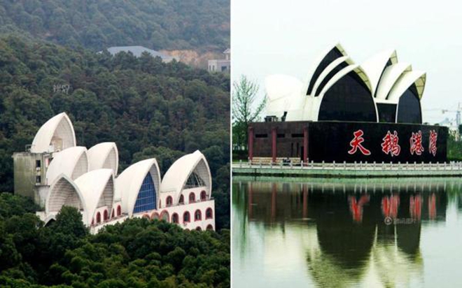 左图为江苏华西村,山寨版的悉尼歌剧院;右图为江苏阜宁县城的白天鹅公园,山寨版的悉尼歌剧院。
