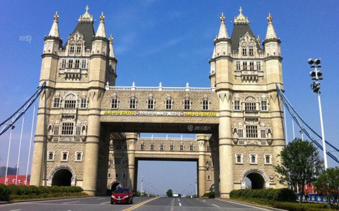 如果说山寨白宫是照搬外国经典建筑浪潮的一个典型案例,散落各地的名建筑山寨版则能反映此浪潮波及之广。图为苏州相城,按照伦敦塔桥造型建造的“塔影桥”。