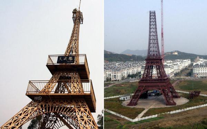 左图为杭州某号称“法国小镇”的小区内耸立的山寨版埃菲尔铁塔,该塔按照3:1的比例修建;右图为福建福清,山寨版的埃菲尔铁塔。