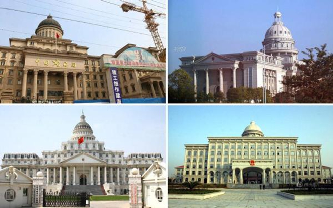 中国到底有多少座“白宫”?答案是――经媒体曝光的约16座。这十余栋山寨版的白宫,绝大部分属于县市级政府等权利机构;其中不少在规模和造价上也都远远超过正版白宫。左上为长沙海关大楼;左下为安徽阜阳颍泉区政府办公楼,耗资3000万元;右上为九江市中级人民法院;右下为湖南娄底政府办公大楼,该楼群曾牵出腐败案,涉案金额2000余万元。