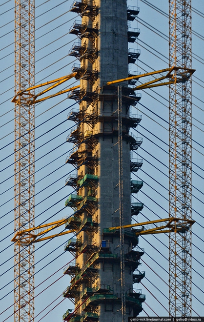 为架设第六号桥墩,在纳基莫夫半岛上堆筑了人工半岛,从半岛上进行紧贴桥墩钻孔作业。第七号桥墩的桩基工事在俄罗斯岛上,在临时的工程用金属小岛的水里着手。
