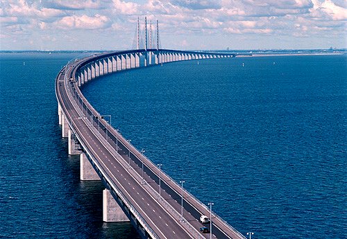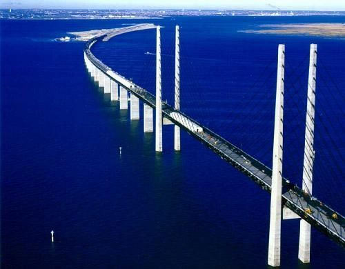 厄勒海峡大桥全程跨度16公里,连接丹麦的哥本哈根和瑞典第三大城市马尔默,于1995年动工,2000年5月完工,是目前世界上已建成的承重量最大的斜拉索桥。大桥的咨询设计工作由丹麦和瑞典的科威、VBB两家公司共同承担。大桥从马尔默出发,海峡中建造了一座人工岛,靠近哥本哈根的一段是铁路与公路合用的海底隧道,因此大桥由三部分组成,其中8公里桥梁、4公里人工岛上公路、4公里海底隧道。它所连接的丹麦东部地区和瑞典南部地区将成为北欧及波罗的海地区国际性都市群最密集、经济最活跃、文化交流最频繁的地区。