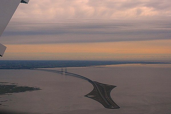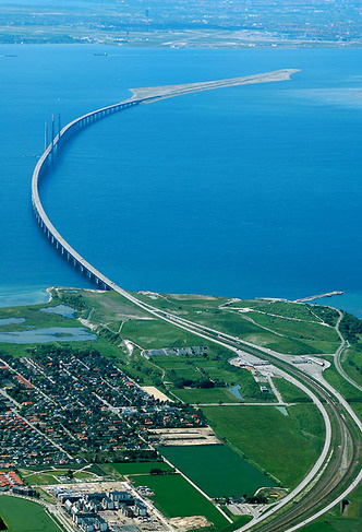 厄勒海峡大桥Oresund Strait Bridge(也称欧尔松大桥),连接哥本哈根和瑞典第三大城市马尔默,于1995年开始动工。全球第十大桥。该桥全长16公里,由西侧的海底隧道、中间的人工岛和跨海大桥三部分组成。