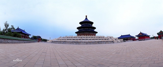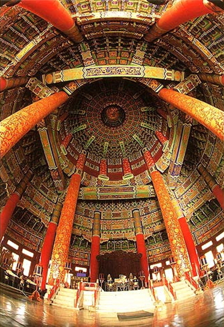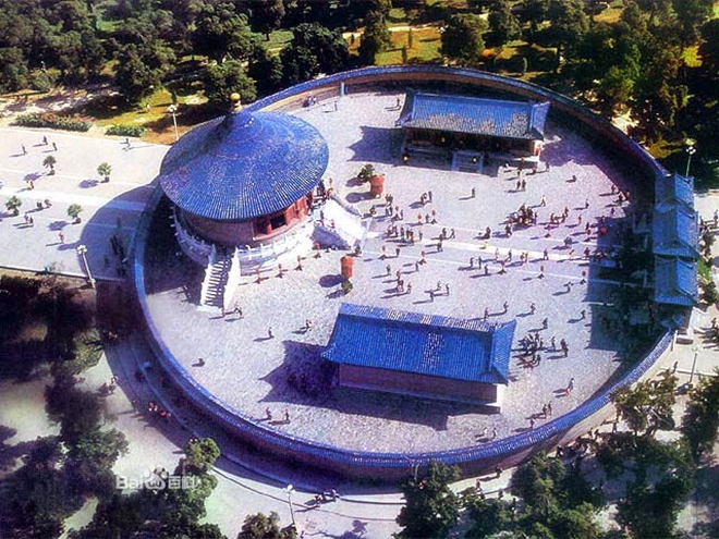 北京天坛占地272万平方米,整个面积比紫禁城(故宫)还大些,有两重垣墙,形成内外坛,主要建筑有祈年殿、皇穹宇、圜丘。圜丘建造在南北纵轴上。坛墙南方北圆,象征天圆地方。圜丘坛在南,祈谷坛在北,二坛同在一条南北轴线上,中间有墙相隔。圜丘坛内主要建筑有圜丘坛、皇穹宇等,祈谷坛内主要建筑有祈年殿、皇乾殿、祈年门等。祈年殿建于明永乐十八年(1420),初名“大祀殿”,是一个矩形大殿。祈年殿高38.2米,直径24.2米,里面分别寓意四季、十二月、十二时辰以及周天星宿,是古代明堂式建筑仅存的一列,也是天坛的主要建筑。圜丘建于明嘉靖九年。每年冬至在台上举行“祭天大典”,欲称祭天台。回音壁是天坛的圆形围墙。因墙体坚硬光滑,所以是声波的良好反射体,又因圆周曲率精确,声波可沿墙内面连续反射,向前传播。