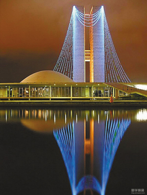 巴西议会大厦(National Congress Building ,Brasilia)矗立在巴西首都巴西利亚市的核心三权广场上,建于1958~1960年,设计人是巴西建筑师O?尼迈耶(Oscar Niemeyer)。整幢大厦水平、垂直的体形对比强烈,而用一仰一覆两个半球体调和、对比,丰富建筑轮廓,构图新颖醒目。在巴西灿烂的阳光下,它就象是一曲恢宏的乐章,自由自在地歌唱着,使人震撼,令人陶醉。
